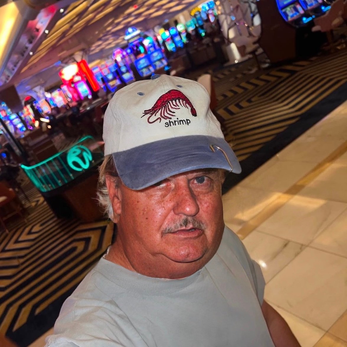A classic adjustable dad hat with a shrimp on it in Sand/Blue